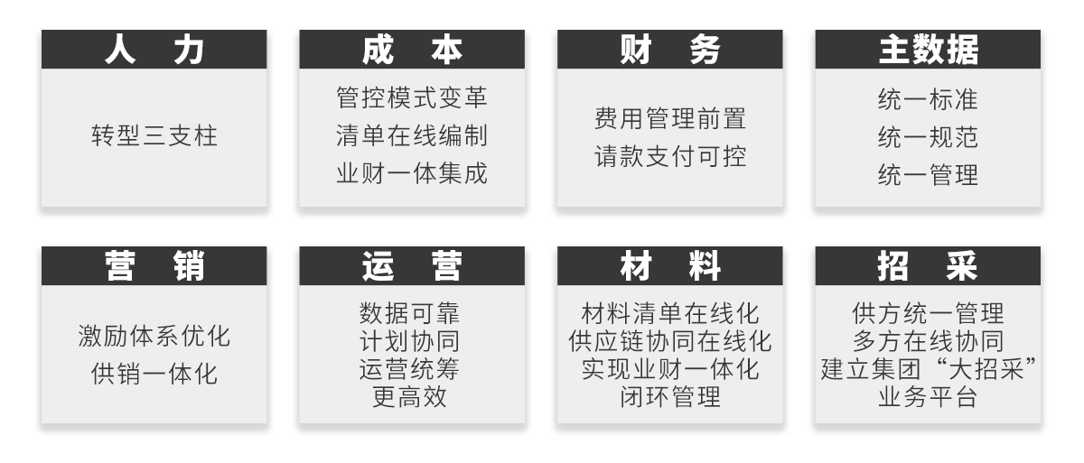 對(duì)內(nèi),搭建以SAP系統(tǒng)為核心的一體化業(yè)務(wù)應(yīng)用平臺(tái),覆蓋主數(shù)據(jù)、運(yùn)營(yíng)、成本、招采、材料、營(yíng)銷(xiāo)、人力、財(cái)務(wù)等核心業(yè)務(wù);與20余套業(yè)務(wù)系統(tǒng)打通,通過(guò)統(tǒng)一數(shù)據(jù)口徑、夯實(shí)數(shù)據(jù)基礎(chǔ),從而提升經(jīng)營(yíng)數(shù)據(jù)可靠性。